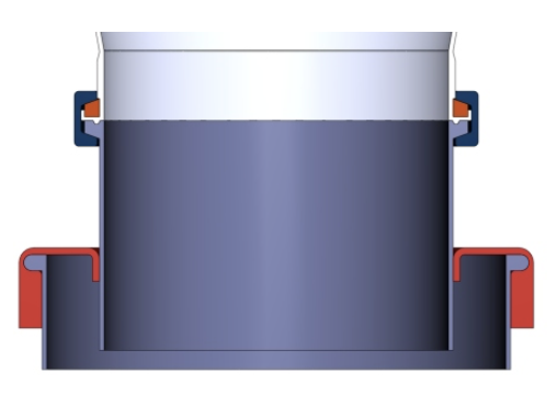 De stofkap (in ’t rood in de schets) wordt over een RVS (Inox) ring gespannen. de valbuis of pijp wordt door de opening geduwd om een stofvrije afdichting te creëren: Het storten van poeder of granulaat kan beginnen.
